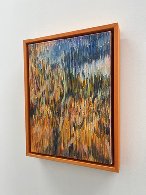 Abstract acrylic painting composed through experiments to dismantle my existing practice and focus specifically on creating the movements of Marram Grass through drips of paint over a canvas. The portrait painting is framed in an orange frame which plays with the vibrancy of its colours.